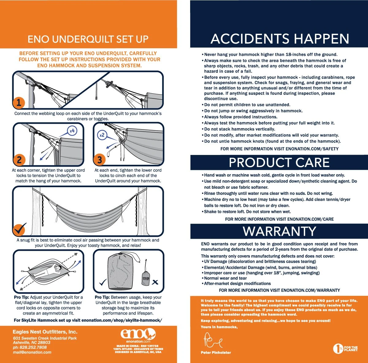 Protecting you from wintry weather, the new-and-improved Blaze™ UnderQuilt is built with industry-leading and sustainably sourced 750FP DownTek™ insulation to shield you with exceptional warmth during your hammock adventures. This new model is also updated with fully adjustable suspension, making it compatible with any ENO hammock (with the exception of the SkyLoft).